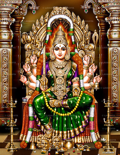 Samayapuram Mariamman is a highly powerful form of the Supreme Mother, the destroyer of disease and illness. She resides at Samayapuram, near Tiruchirapalli in Tamil Nadu. The deity here is made of sand and clay, and hence abhishekam is not done to the main deity but to a smaller stone deity in front of the main one. It is said of Samayapuram Mariamman - 'Samayathil kaappaal' , meaning She saves Her devotees on time. She is known to cure the most incurable of diseases and illnesses. Devotees make offerings of 'mavilakku' (lamps made of rice flour, jaggery and ghee, in which ghee is poured and wicks are lit), aalroopam (as in Guruvayur) & raw salt. May Samayapurathaal, the reigning queen of Samayapuram bless one and all with a happy, illness free life.