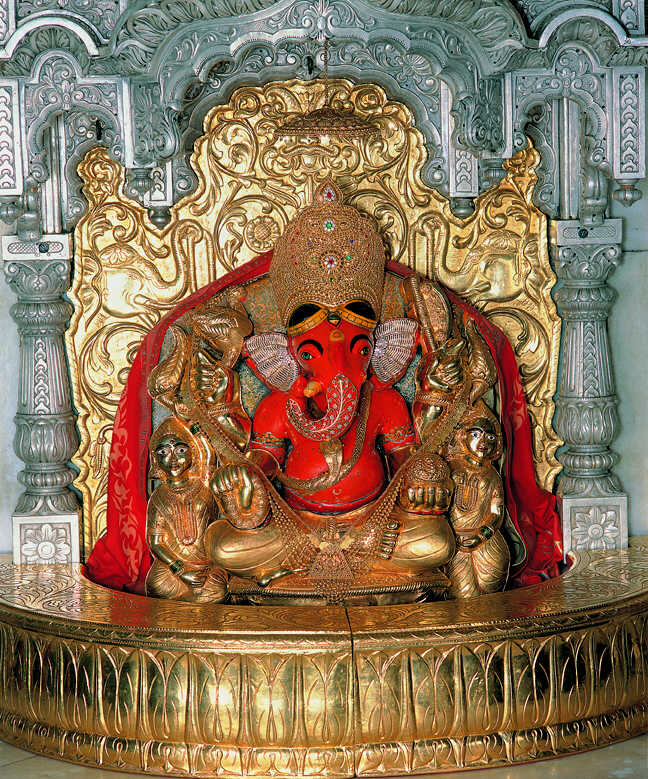 The deity made of black stone has turned orange in colour due to the regular application of sindoor over the years. The Lord holds a lotus in the upper right hand, an axe in the upper left, a rosary (japa mala) in the lower right & a bowl full of modaks in the lower left hand. His trunk is curved to the right, which is considered very special. He is flanked by His wives Ridhhi & Siddhi who signify sanctity, success, wealth & prosperity.